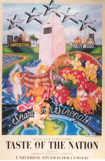 Produced for Share Our Strength to promote Taste of the Nation, held at Universal Studios Hollywood. Sponsored by American Express and Calphalon Corp. 100% of all sales of this image will be donated to Share Our Strength. Original artwork acrylic inks on Bristol Board. Framed and available + shipping. Email for pricing. Tax deductible |